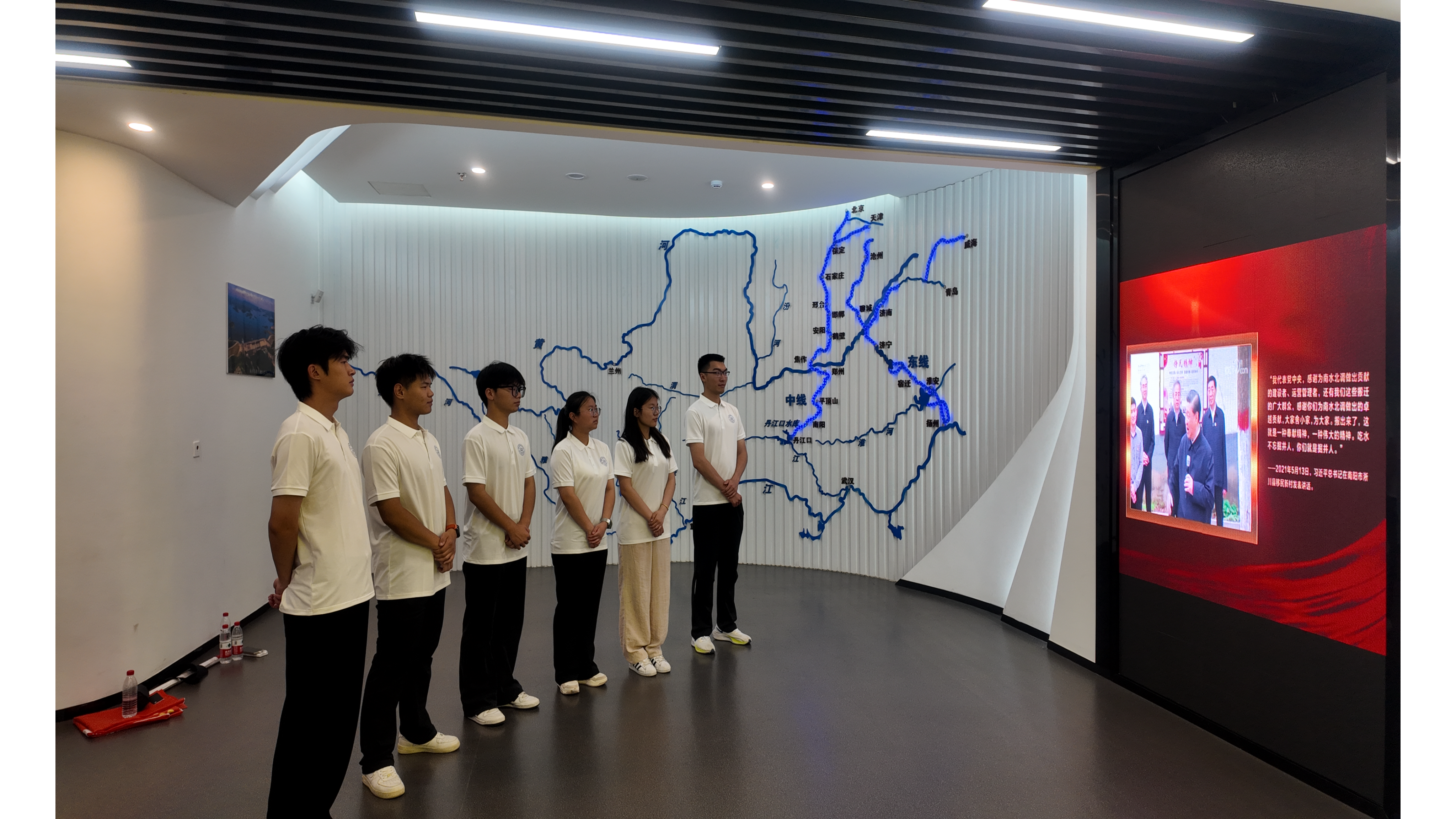 从毛主席提出南水北调构想开始,一代又一代建设者们为之不懈努力,历经数十年,终于实现了这一世纪工程。当师生们走到习近平总书记 2021 年在南阳市淅川县讲话的屏幕前时,纷纷驻足观看。总书记对南水北调移民工程中人们舍小家为大家奉献精神的评价,让大家深受触动。那一句句朴实而坚定的话语,仿佛将大家带回到了移民们告别故土、奔赴新家园的场景,深刻体会到了无私奉献和团结协作的伟大力量。